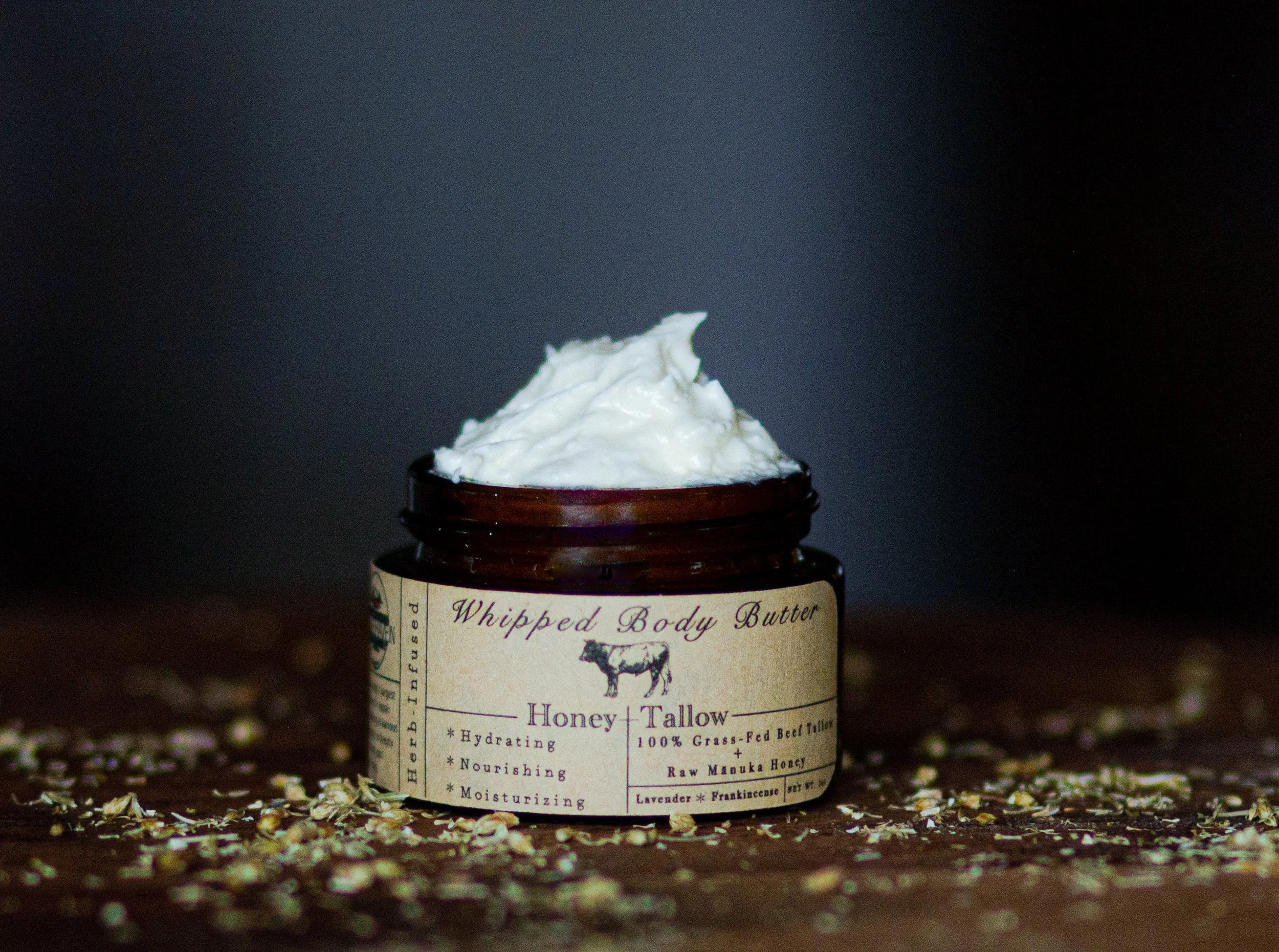 Our Body Butter is made with 100% grass-fed, and grass finished beef tallow and pure raw Mānuka Honey. It is herb-Infused with Olive Oil, Calendula + Yarrow, Rosehip oil, Vitamin E, Pomegranate Seed, Shea butter, Jojoba oil and Aloe Vera. Then it is whipped up and left unscented or finished off with a light scent of Lavender + Frankincense Essential Oil giving this body butter the touch your skin needs.